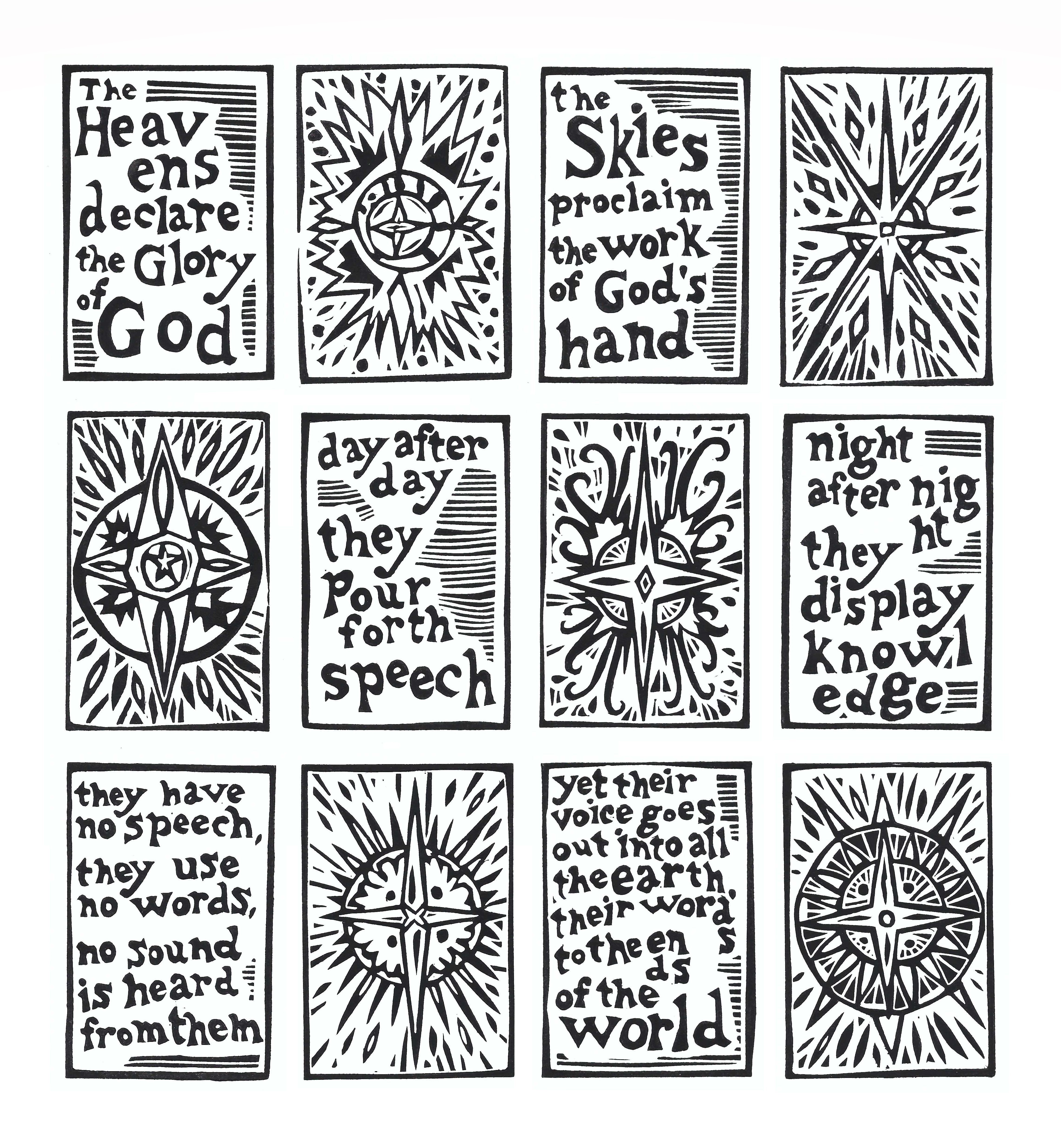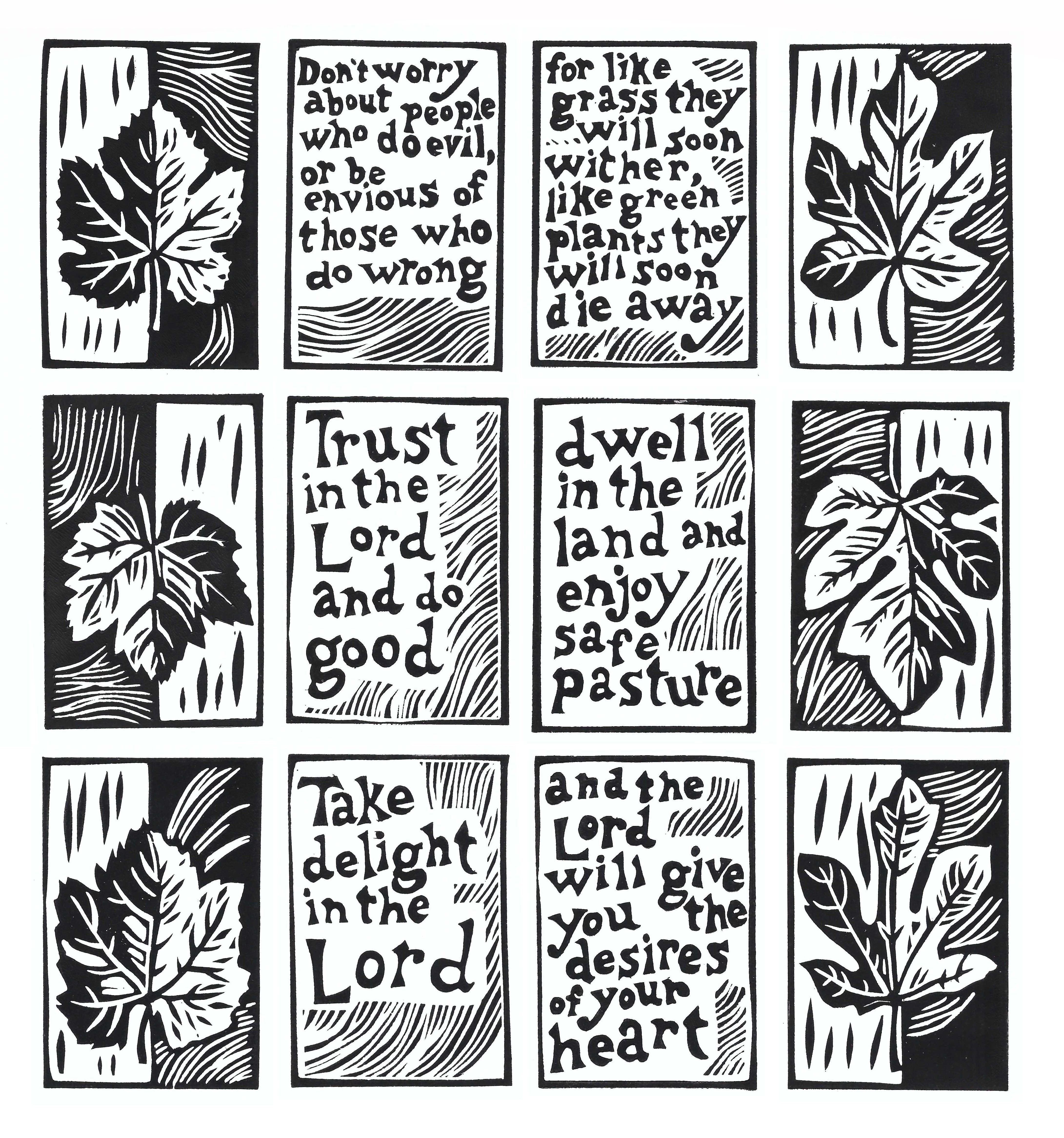 I have been making more of these four-by-three tile grids. These two images illustrate the text of Psalm 19:1-4 and Psalm 37:1-4.