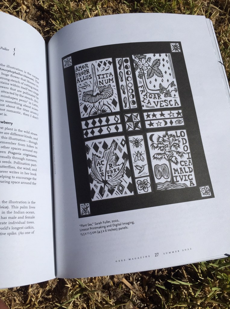 I have linocut art and an essay in the current copy of Geez magazine: Issue 65, “Healing Sex,” Summer 2022.