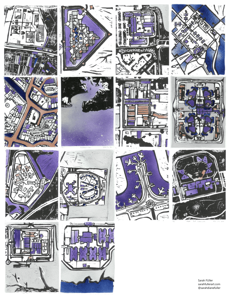 I’m honored to have a series of prints I made in 2013-2014 being used as part of the Lenten services at Pasadena Mennonite Church. I made this series of aerial views of sites of incarceration as a Lenten reflection, a Stations of the Cross that asks us to consider the suffering of human beings in this system. I was inspired to make this after meeting many people whose lives were touched by the jail and prison system, and other forms of violence of many kinds, during times visiting the LA Catholic Worker soup kitchen on Skid Row. Some of the stations reflect particular events that were in the news at the time, and others reflect sites that have been infamous for a long time. The traditional stations of the cross depict the sufferings of Christ during the process of the crucifixion, a deadly interaction with the carceral system. The world is full of many kinds of suffering- ecological, victims of crime and violence, racism and gender-based violence, poverty, interactions with crushing state systems. Lent is a time to reflect and mourn, and think about justice and action.