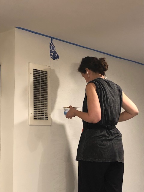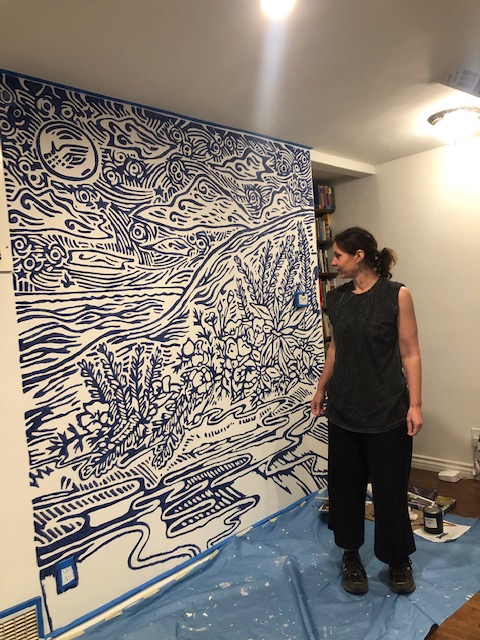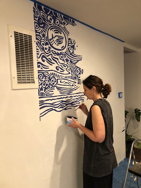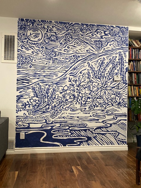 I had a great time undertaking this mural project for a private home. The homeowners and I discussed what kind of image they would like, and I made an original linocut print illustration of their idea. We projected it onto the wall and traced out the pattern of the linocut image, then I painted in the image in inky blue. It’s an ocean scene with botanical elements and lots of linocut textures.