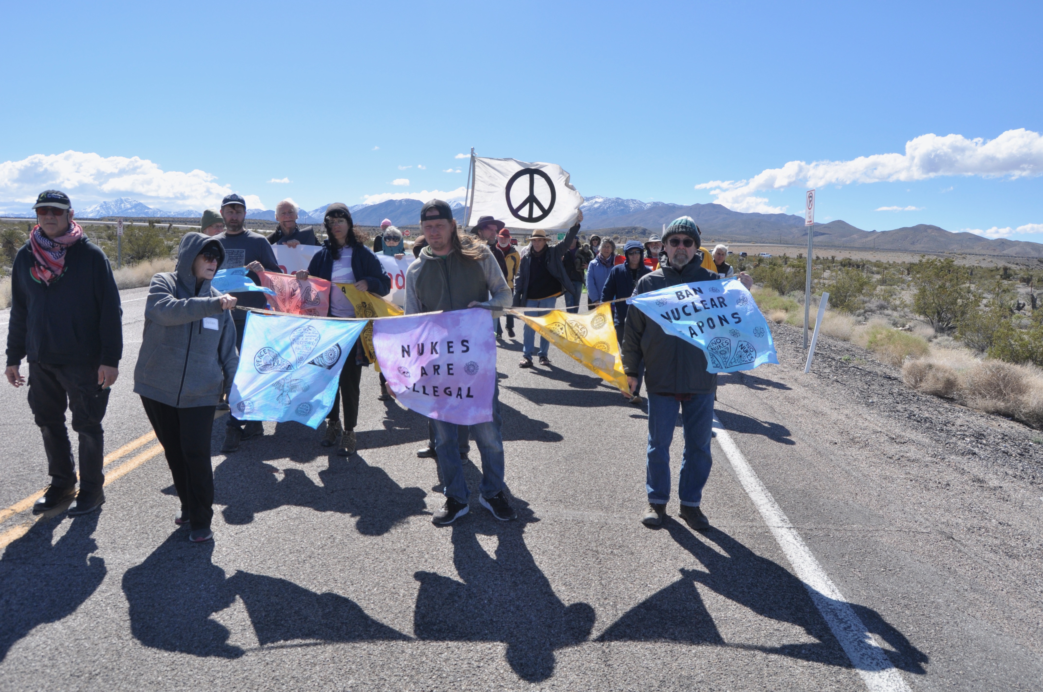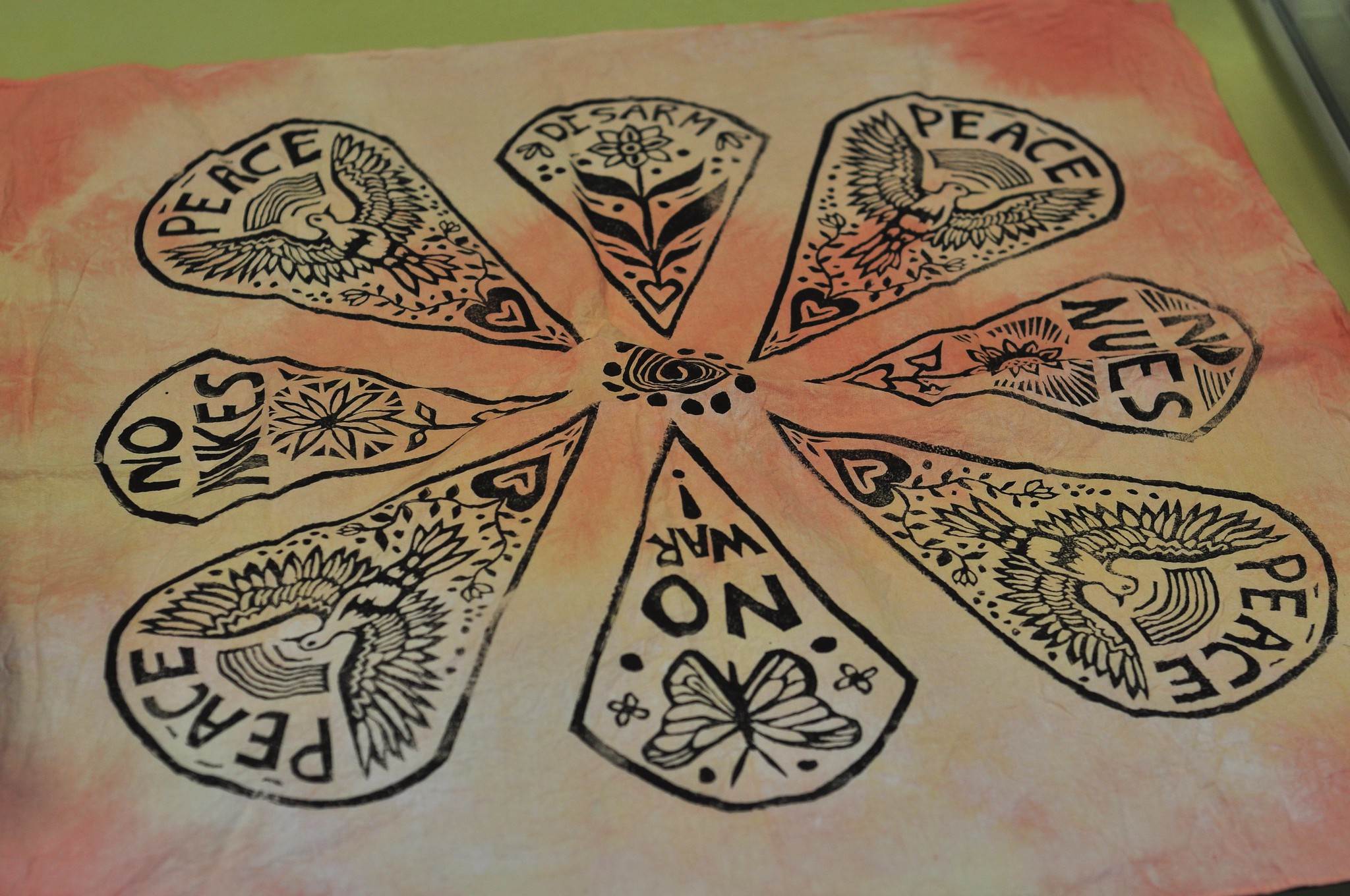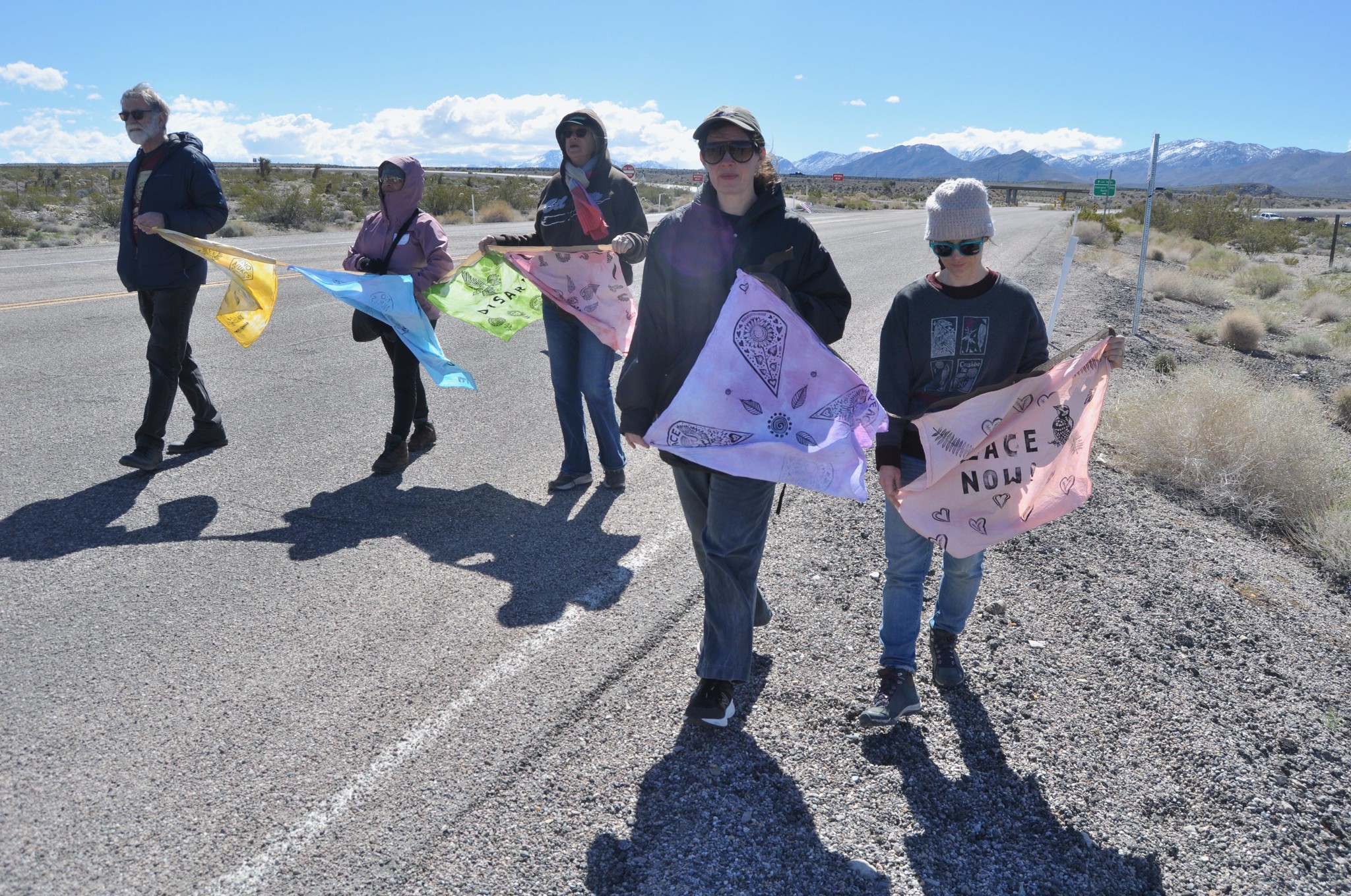 The Pacific Life Community meets to promote a world free from nuclear weapons. The PLC met this year near Las Vegas to witness at the Nevada Nuclear Test Site. We made banners out of fraktur-inspired block printing art that I designed. Photos by Tim Nafziger.