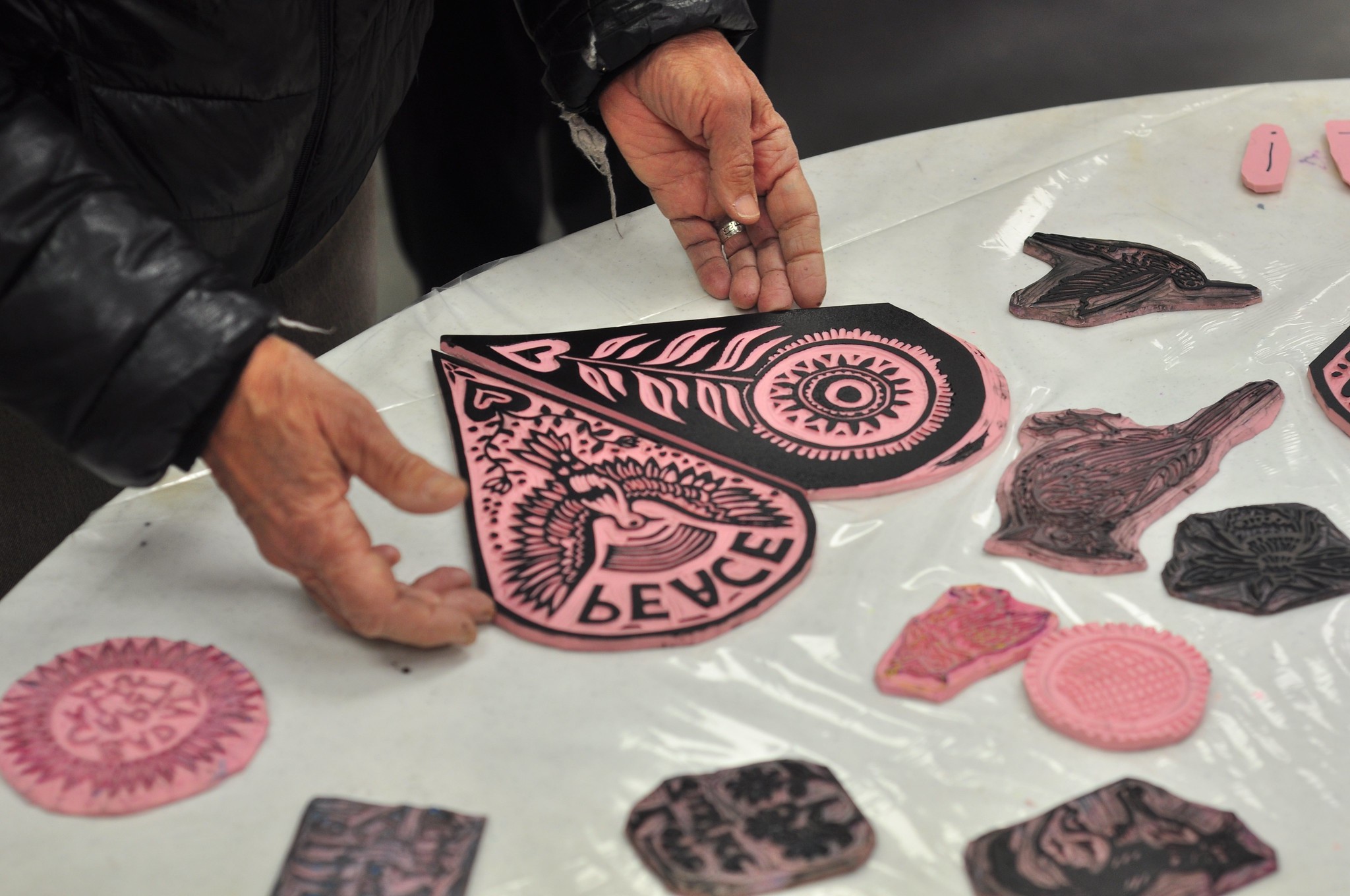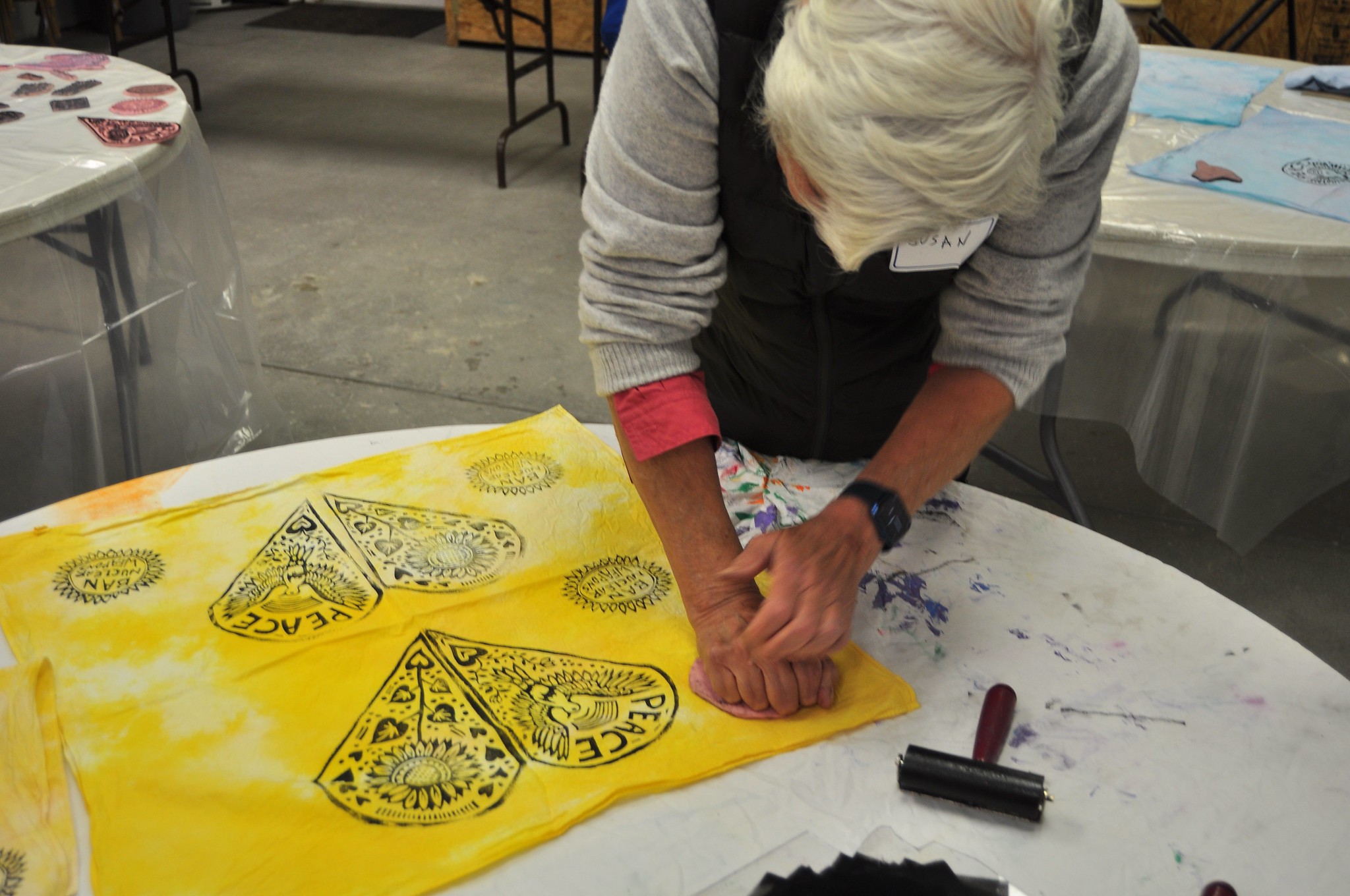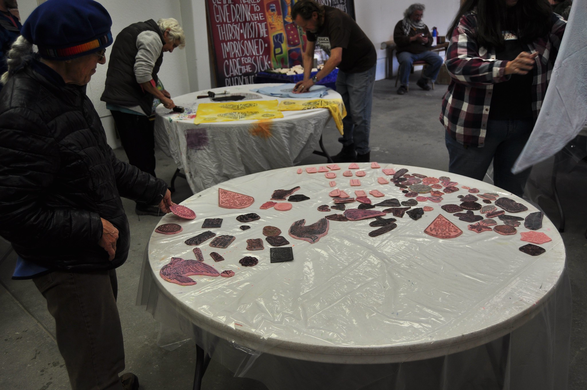 The Pacific Life Community meets to promote a world free from nuclear weapons. The PLC met this year near Las Vegas to witness at the Nevada Nuclear Test Site. We made banners out of fraktur-inspired block printing art that I designed. Photos by Tim Nafziger.