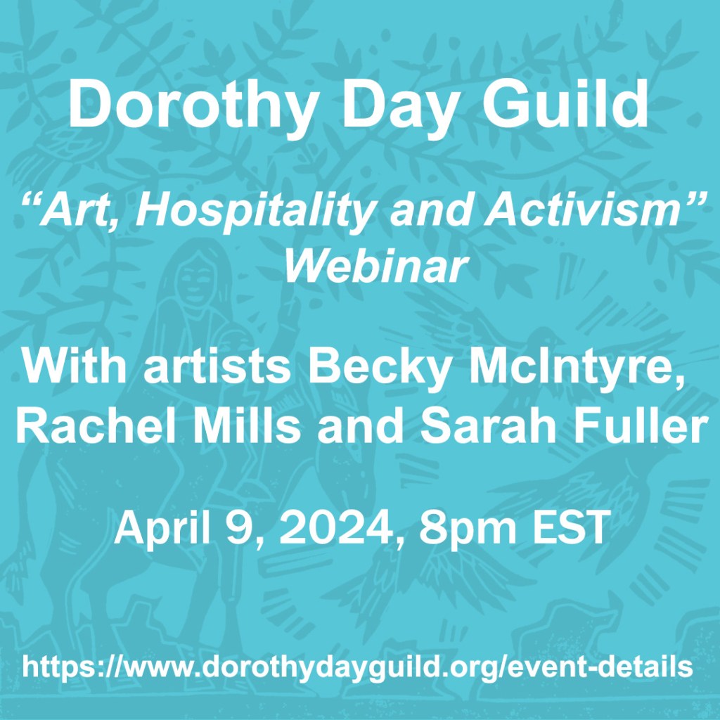 On April 9 at 8pm EST, artists Rachel Mills, Becky McIntyre and I will be discussing our art and the Catholic Worker movement at an online talk sponsored by the Dorothy Day guild. Join us! Information about how to join is here.