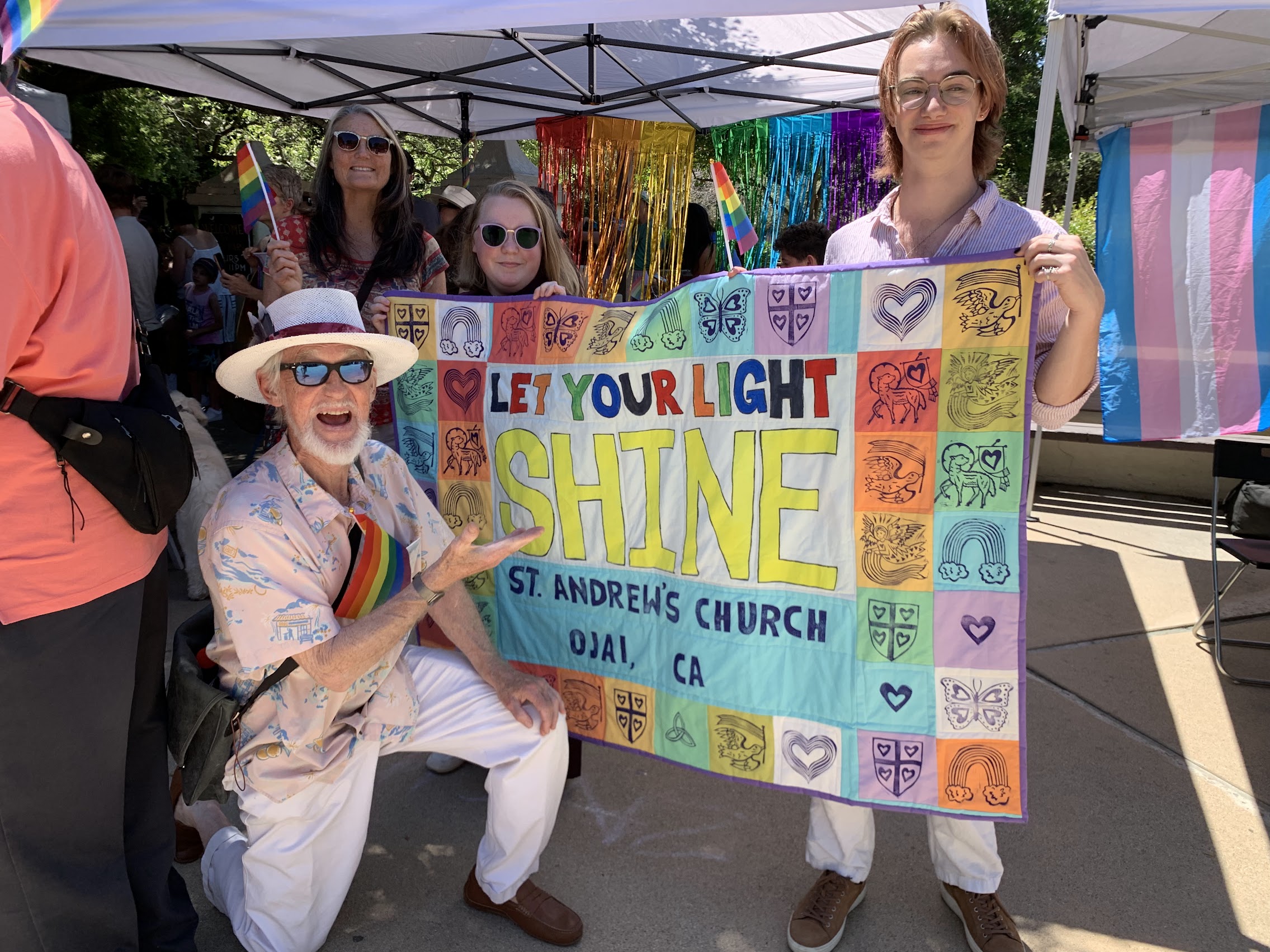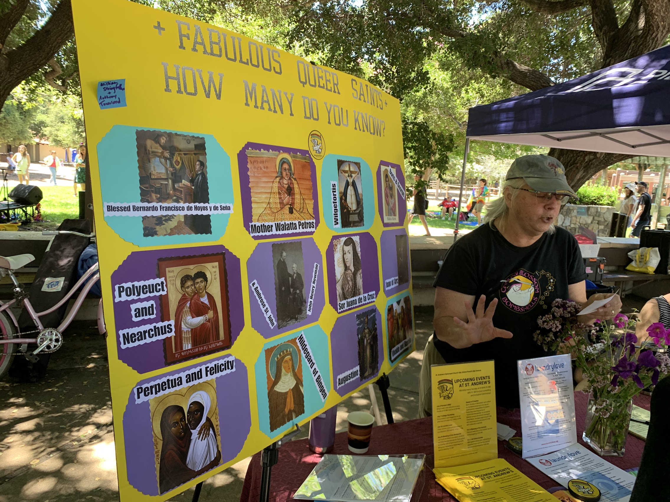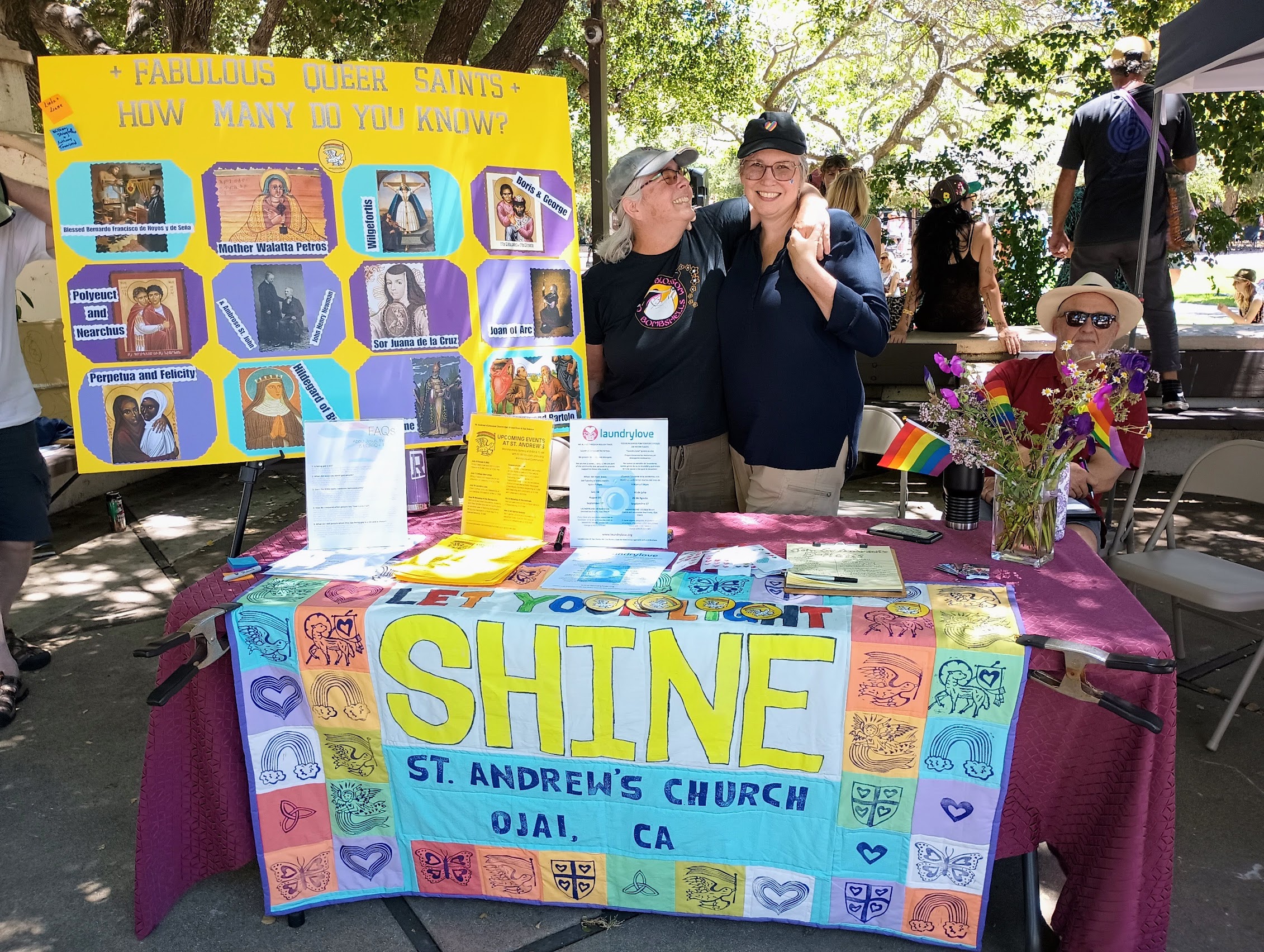 These photos are some good memories from the banner I made with St. Andrew’s Episcopal Church in Ojai last year. The folks at the church printed the fabric squares with linocut art I carved at an après-church workshop, then took the banner on parade for the Ojai Pride Walk. It paired fantastically with their booth quiz activity created by Heidi and Rose: “Fabulous Queer Saints: How Many Do You Know?” (Photos by Heidi Thompson)