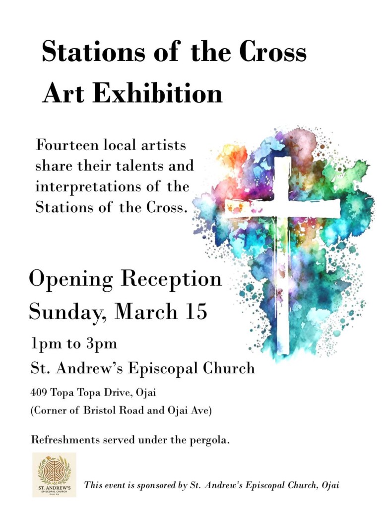St. Andrew’s Episcopal Church in Ojai, CA is sponsoring a collaborative Stations of the Cross art project with various local artists. Each artist is creating one of the Stations of the Cross for a group project to be displayed in the sanctuary of the church as part of the church’s Lenten observance. The reception for the project will be held on Sunday, March 15th, 2026 from 1pm to 3pm.